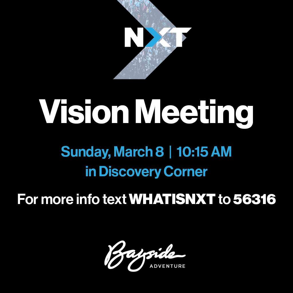 NXT Vision Info Meeting : You’re invited to hear more about the vision behind NXT at Bayside and where we’re headed together. Sunday, March 8, 10:15 - 10:45 AM Location: Discovery Corner Come Learn more, ask questions, and discover how you can be part of what’s next. Bagels will be provided. For more information, text […]
